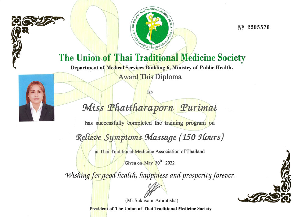 Ta is een gediplomeerd masseuse met uitgebreide kennis van de menselijke anatomie. Met jarenlange ervaring in traditionele Thaise massage, biedt ze effectieve behandelingen voor zowel ontspanning als spierherstel. Haar focus ligt altijd op jouw welzijn en comfort. Geen erotische massages – enkel professionele behandelingen.